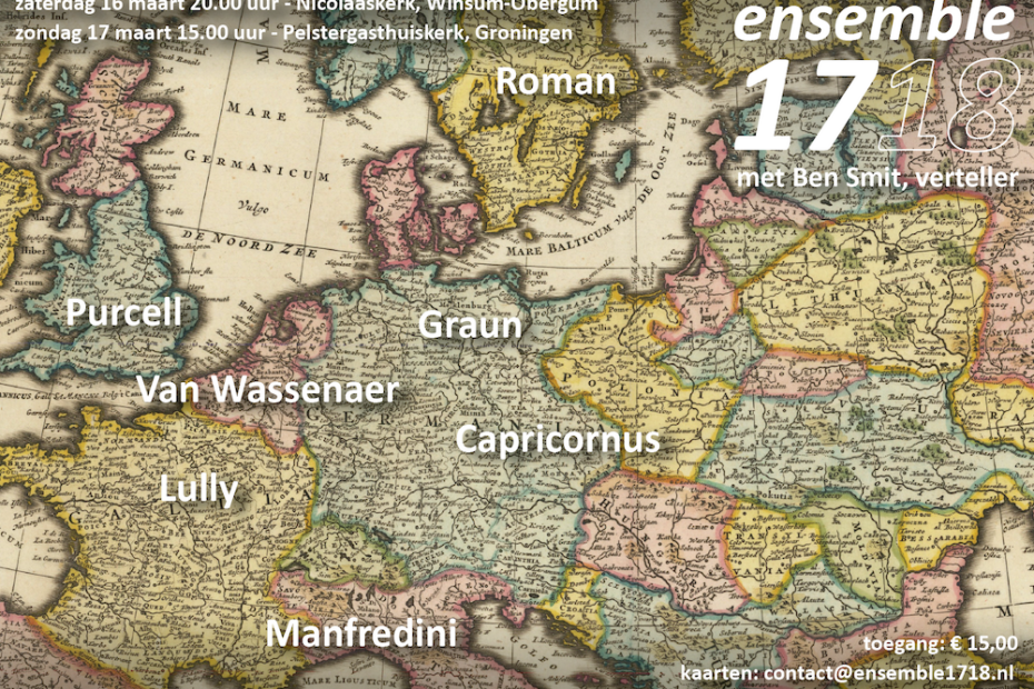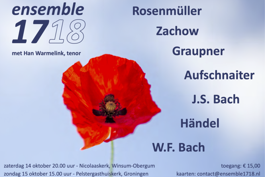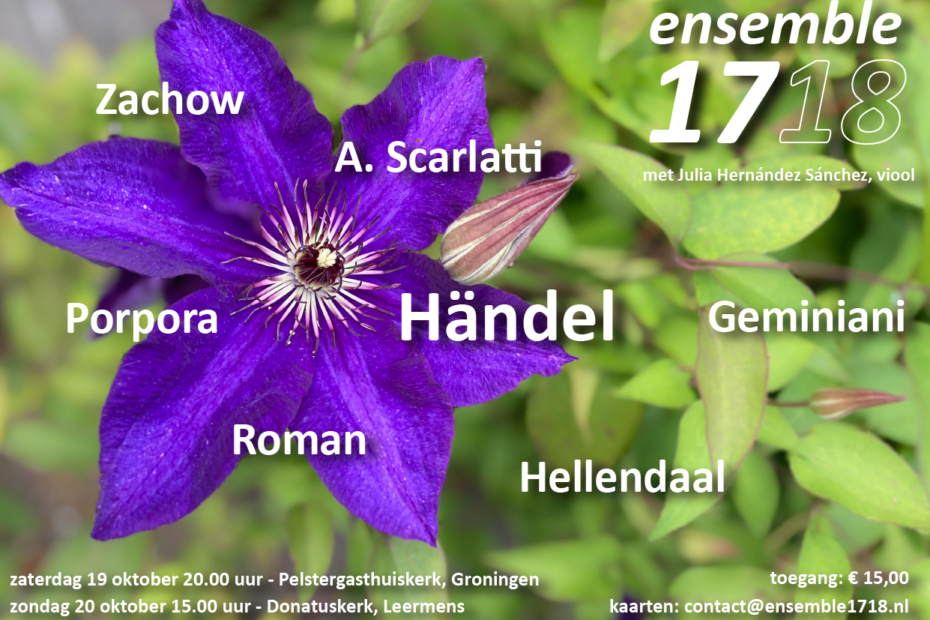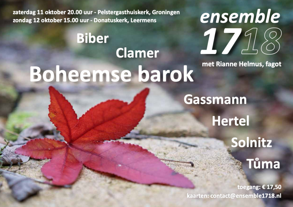 We spelen zaterdag 11 oktober om 20 uur in de Pelstergasthuiskerk in Groningen en zondag 12 oktober om 15 uur in de Donatuskerk in Leermens. Kaarten via contact@ensemble1718.nl